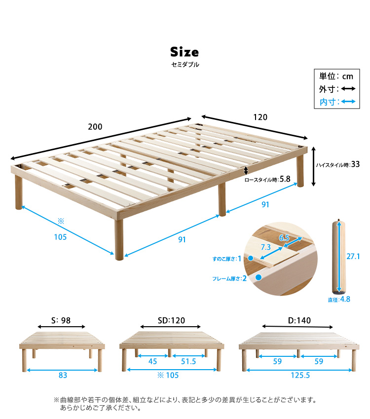 北欧パイン すのこベッド ベッド 2段階高さ調節 セミダブル