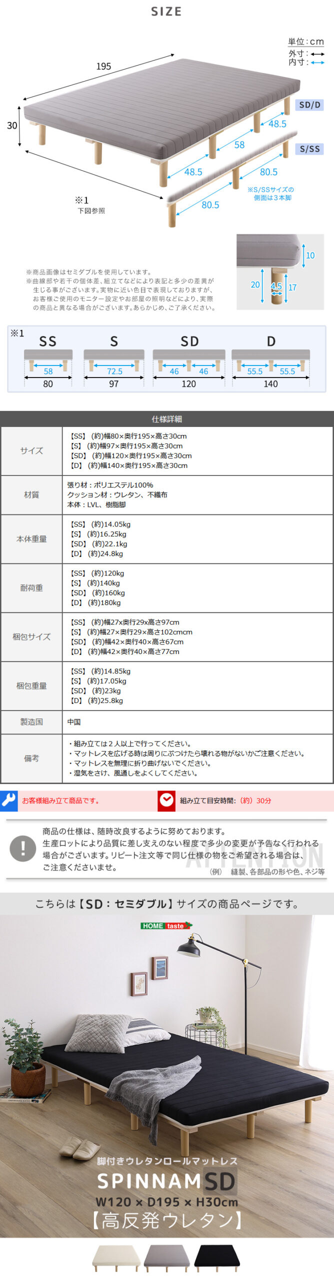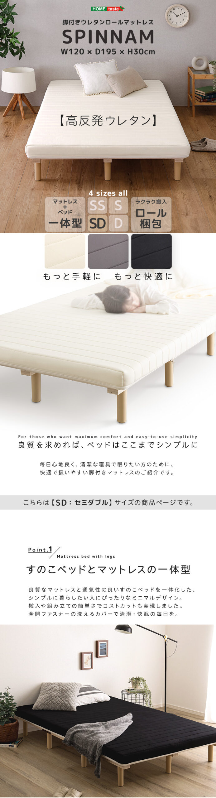 脚付きウレタンロールマットレス【SPINNAM-スピンナム-】 セミダブルサイズ