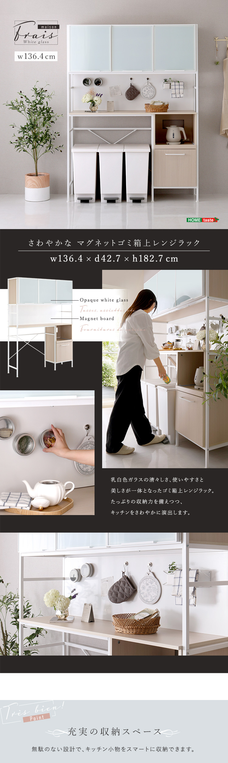 さわやかなマグネットゴミ箱上レンジラック ホワイトガラス【Frais-フレ-】