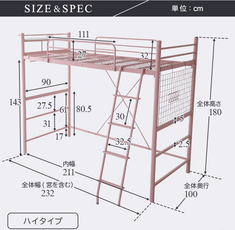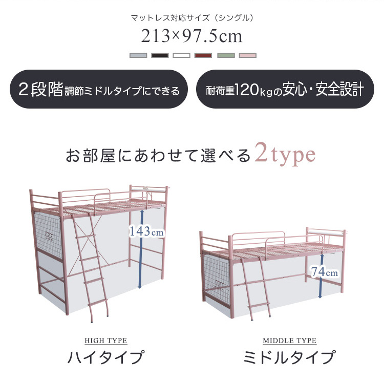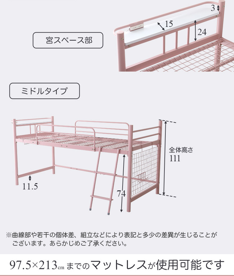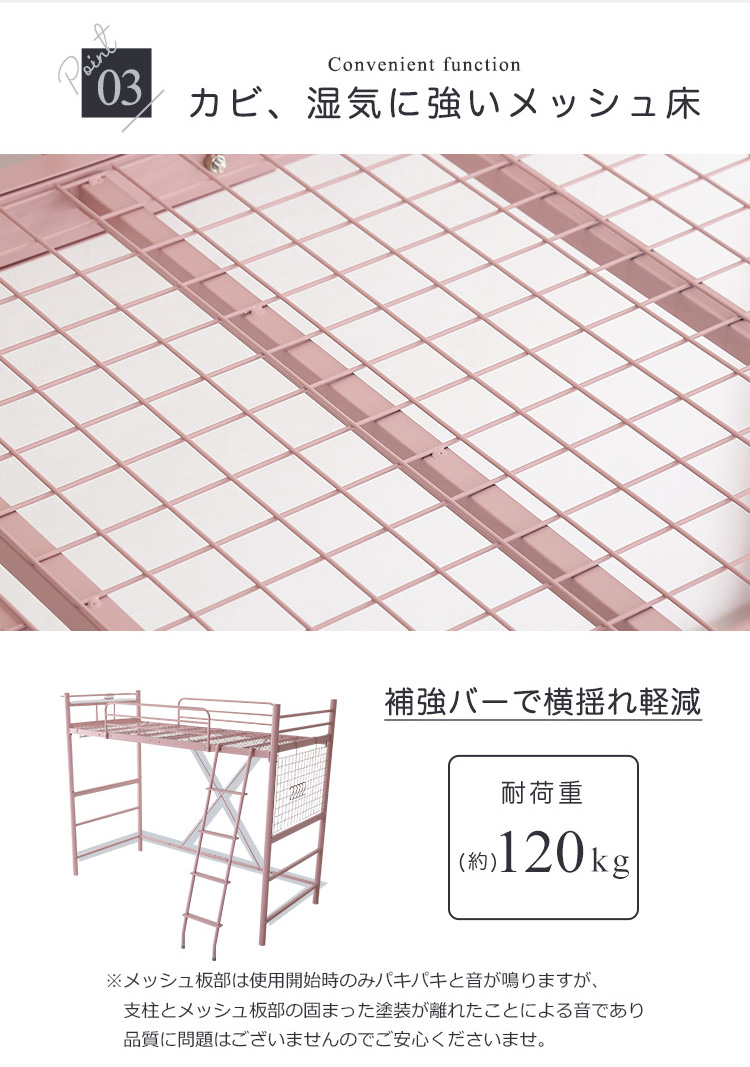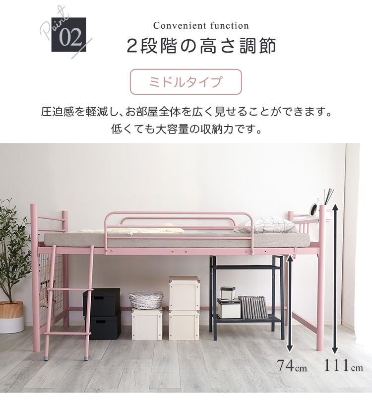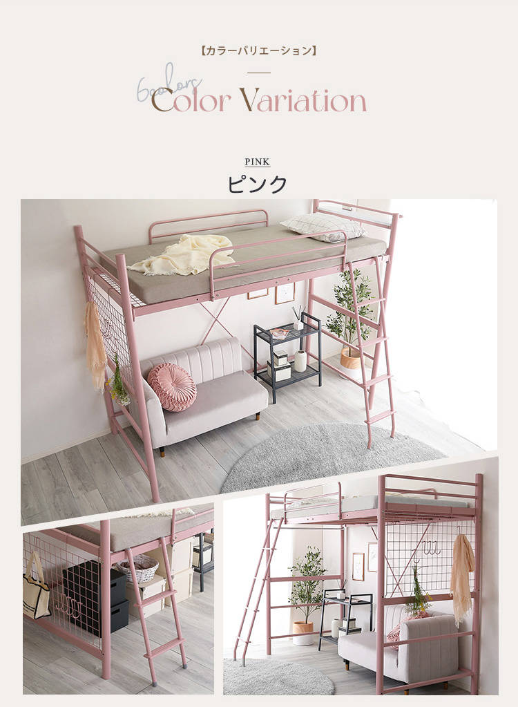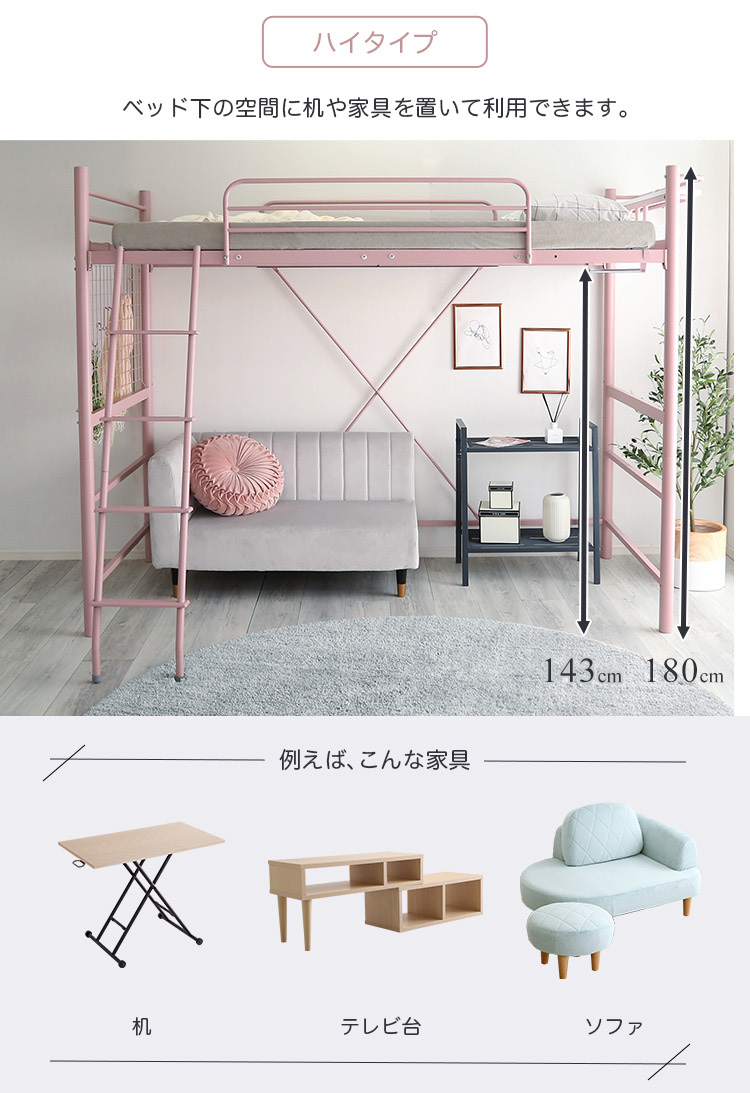 大人かわいい ロフトベッド シングル 宮棚 2口コンセント