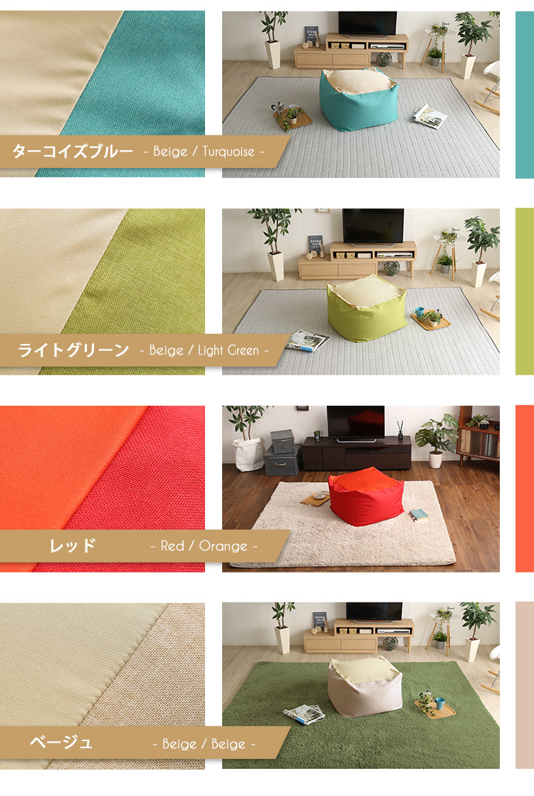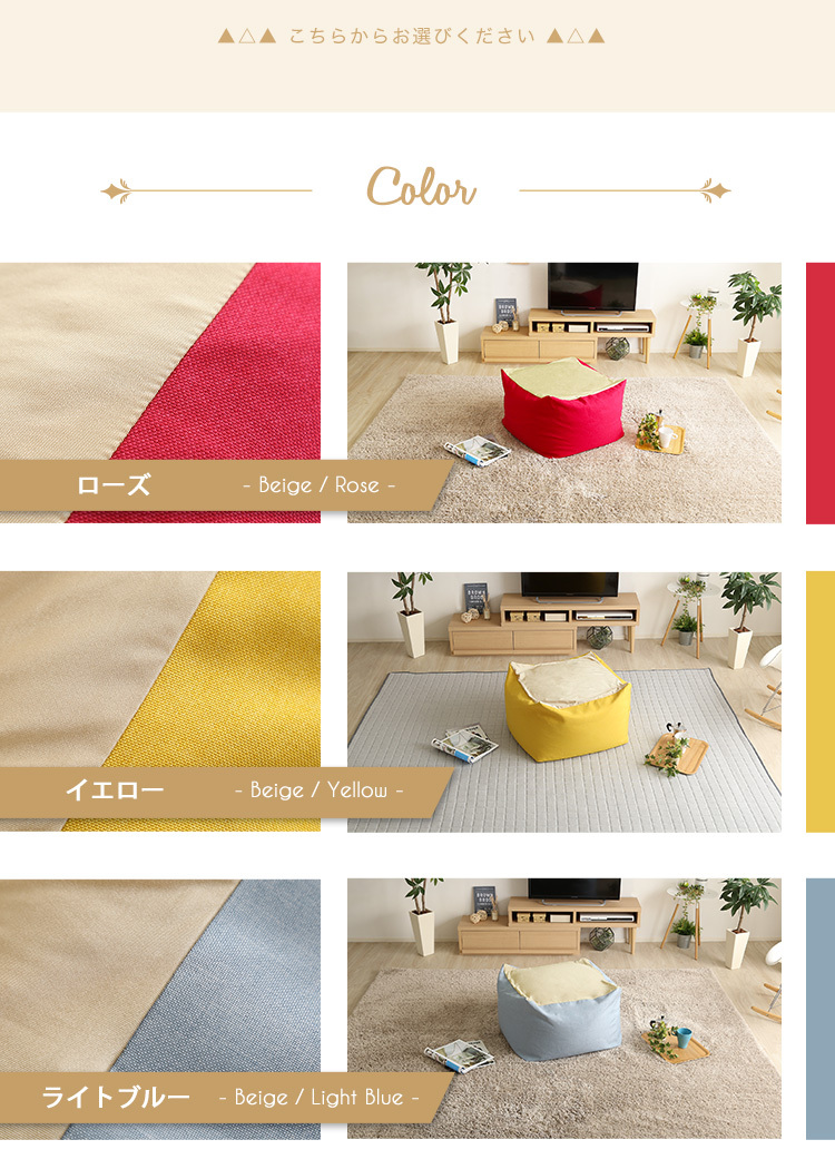イエロー, ターコイズブルー, ベージュ, ライトグリーン, ライトブルー, レッド, ローズ