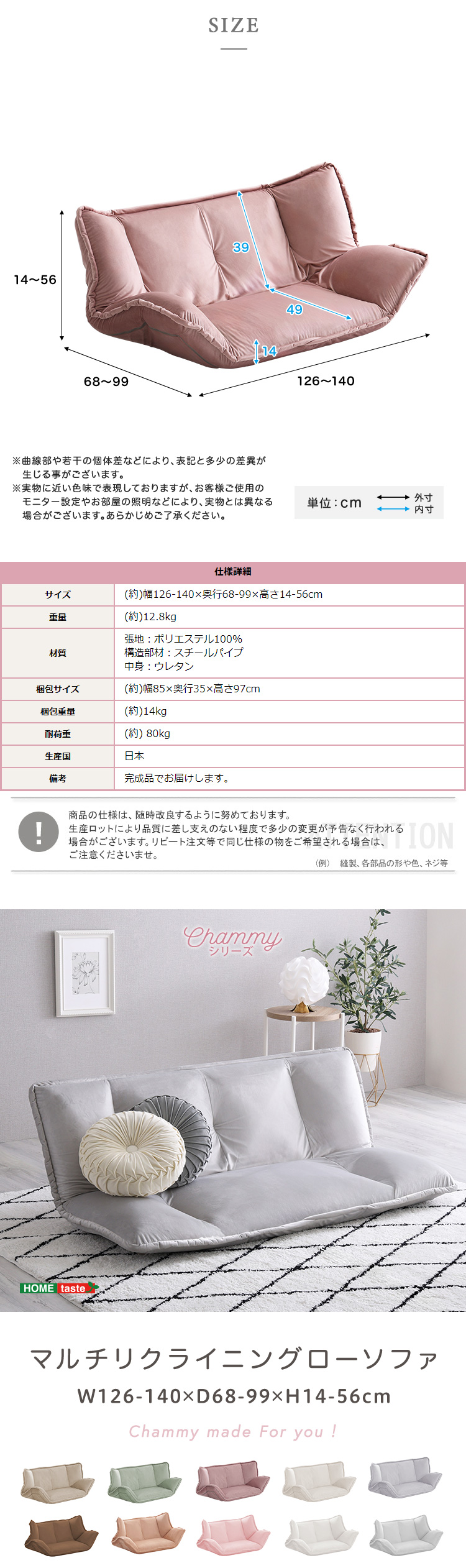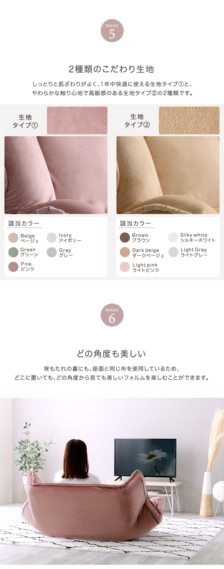 アイボリー, グリーン, グレー, シルキーホワイト, ダークベージュ, ピンク, ブラウン, ベージュ, ライトグレー, ライトピンク