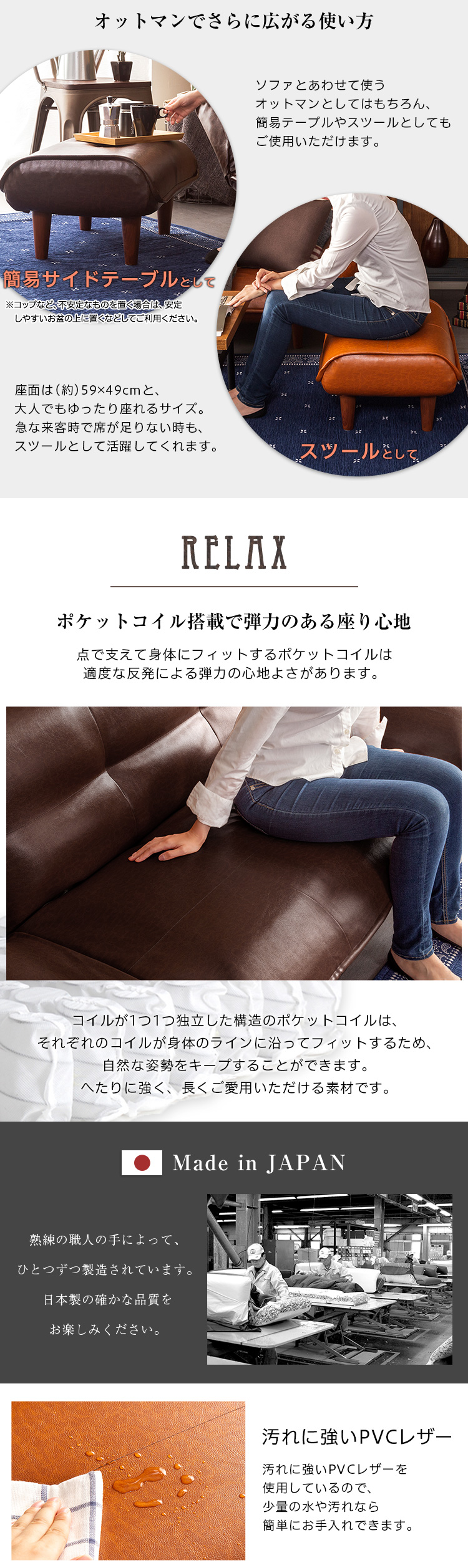 ヴィンテージソファ 2人掛け PVCレザー オットマン