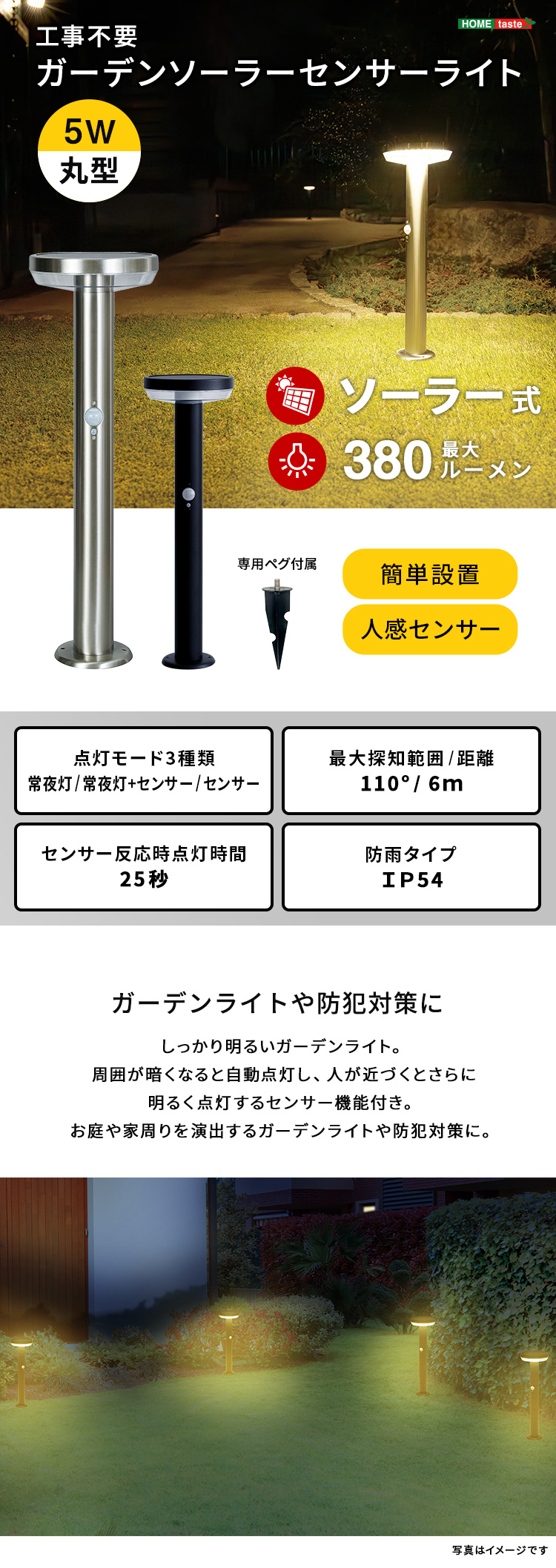 工事不要!ガーデンソーラーセンサーライト 5W丸型