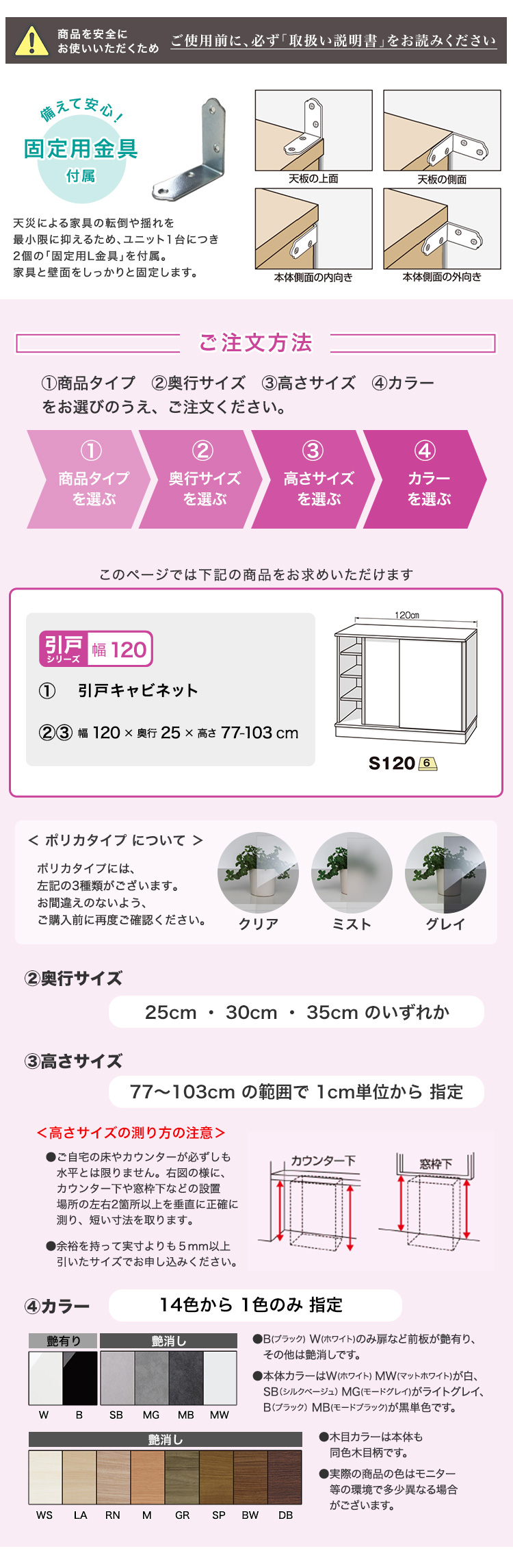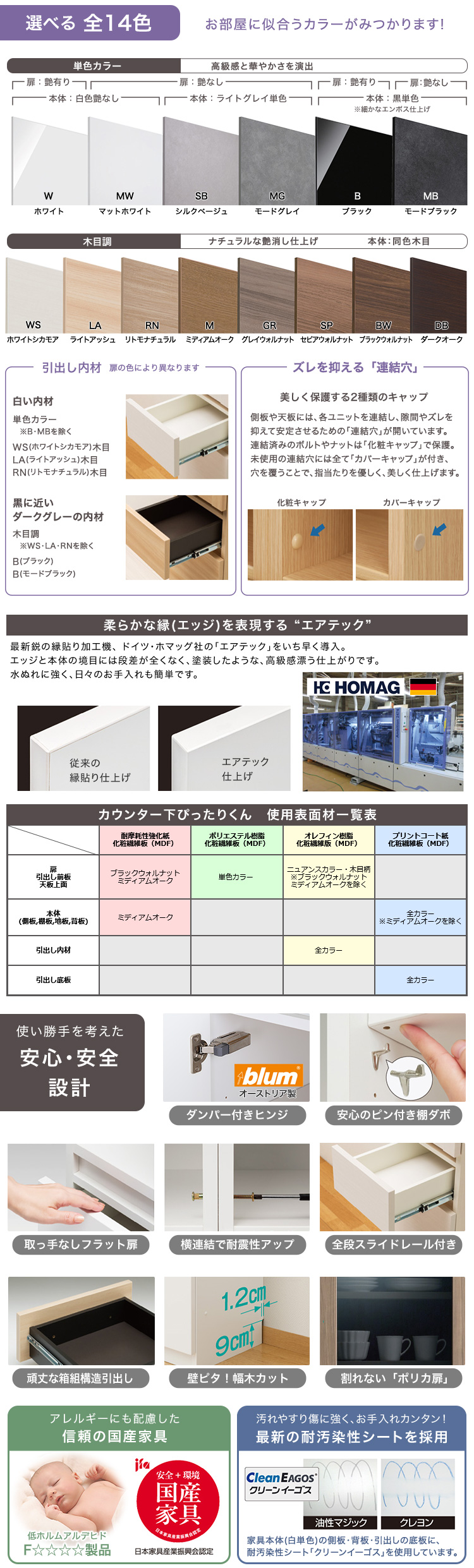 グレイウォルナット木目(艶消), シルクベージュ(艶消), セピアウォルナット木目(艶消), ダークオーク木目(艶消), ブラックウォルナット木目(艶消), ブラック(艶有), ホワイトシカモア木目(艶消), ホワイト(艶有), マットホワイト(艶消), ミディアムオーク木目(艶消), モードグレイ(艶消), モードブラック(艶消), ライトアッシュ木目(艶消), リトモナチュラル木目(艶消)