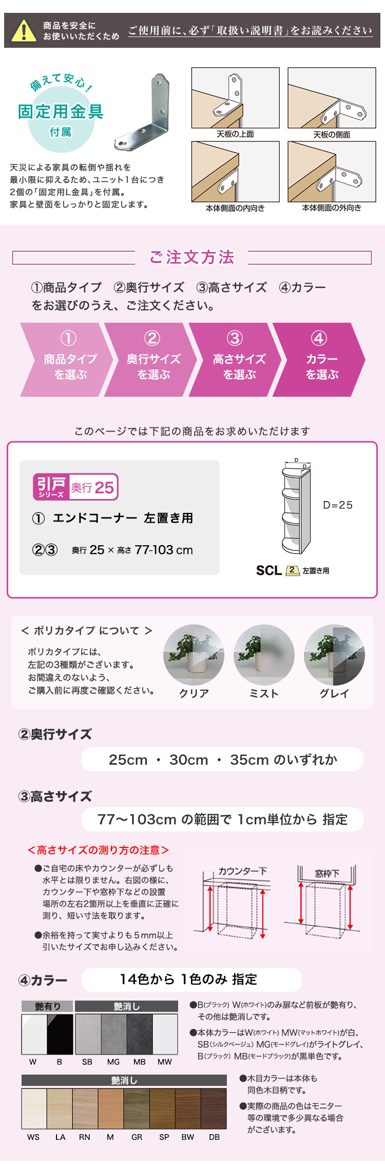 グレイウォルナット木目(艶消), シルクベージュ(艶消), セピアウォルナット木目(艶消), ダークオーク木目(艶消), ブラックウォルナット木目(艶消), ブラック(艶有), ホワイトシカモア木目(艶消), ホワイト(艶有), マットホワイト(艶消), ミディアムオーク木目(艶消), モードグレイ(艶消), モードブラック(艶消), ライトアッシュ木目(艶消), リトモナチュラル木目(艶消)