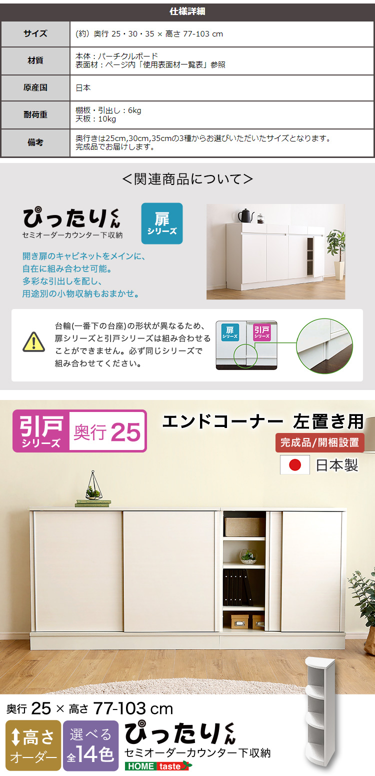 カウンター下収納 エンドコーナー左 幅25cm 日本製
