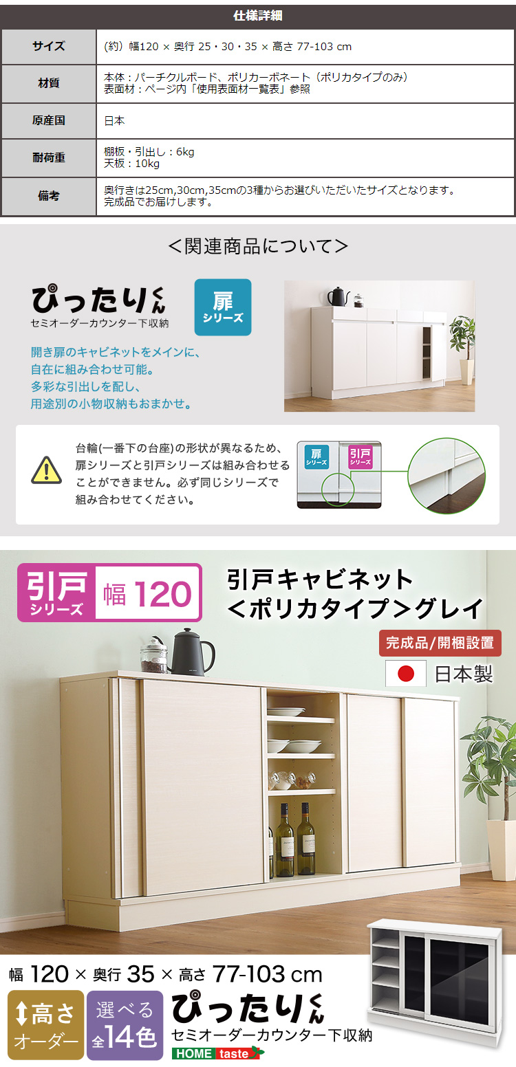 【引戸シリーズ】セミオーダーカウンター下収納ぴったりくん キャビネット(ポリカタイプ グレイ) 幅120cm×奥行35cm