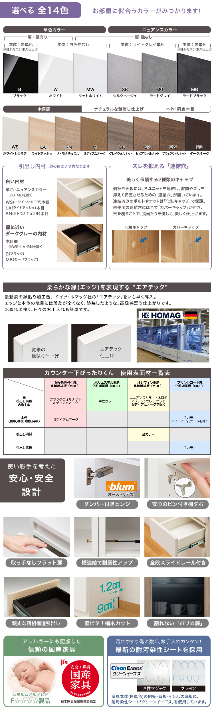 グレイウォルナット木目(艶消), シルクベージュ(艶消), セピアウォルナット木目(艶消), ダークオーク木目(艶消), ブラックウォルナット木目(艶消), ブラック(艶有), ホワイトシカモア木目(艶消), ホワイト(艶有), マットホワイト(艶消), ミディアムオーク木目(艶消), モードグレイ(艶消), モードブラック(艶消), ライトアッシュ木目(艶消), リトモナチュラル木目(艶消)