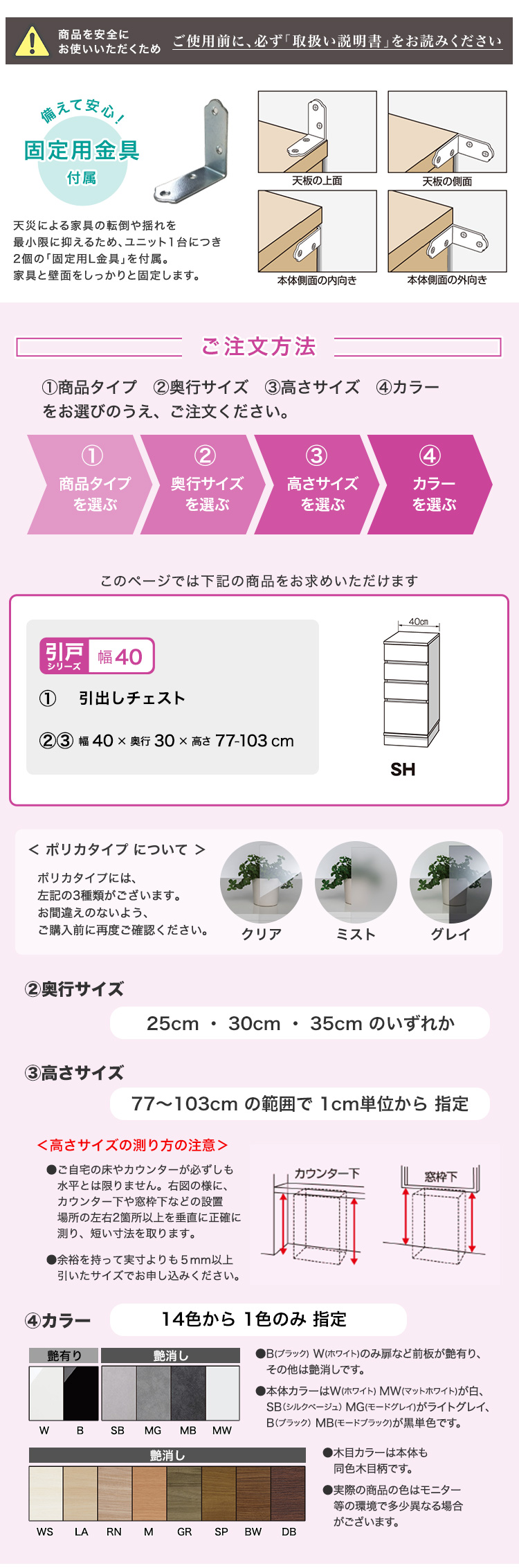グレイウォルナット木目(艶消), シルクベージュ(艶消), セピアウォルナット木目(艶消), ダークオーク木目(艶消), ブラックウォルナット木目(艶消), ブラック(艶有), ホワイトシカモア木目(艶消), ホワイト(艶有), マットホワイト(艶消), ミディアムオーク木目(艶消), モードグレイ(艶消), モードブラック(艶消), ライトアッシュ木目(艶消), リトモナチュラル木目(艶消)