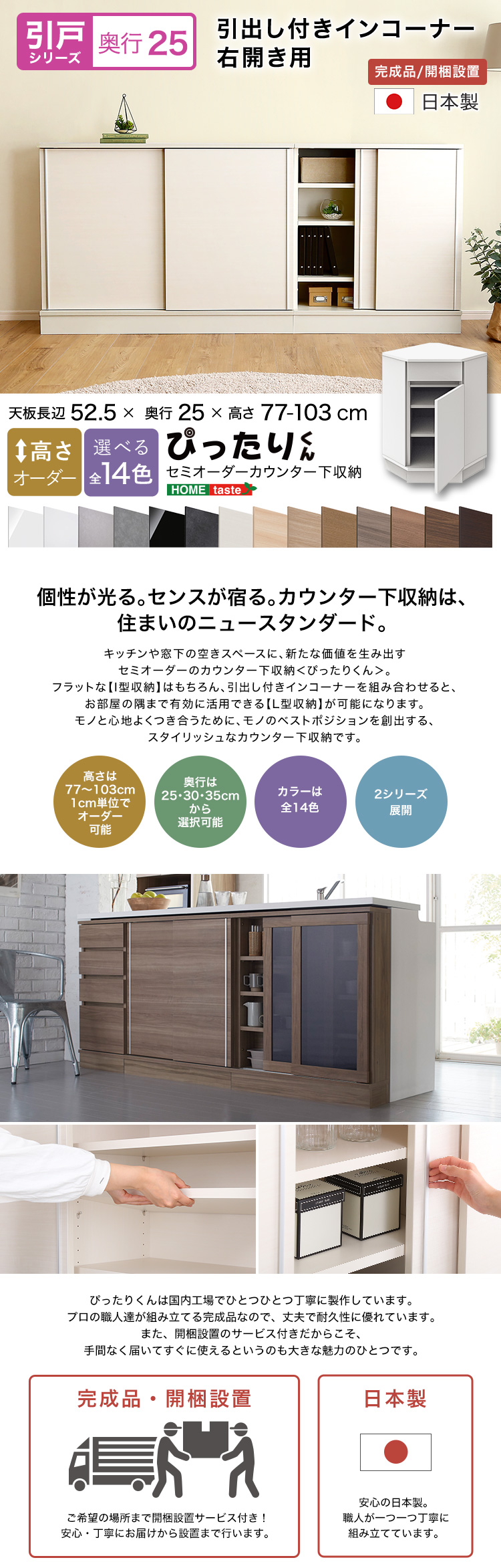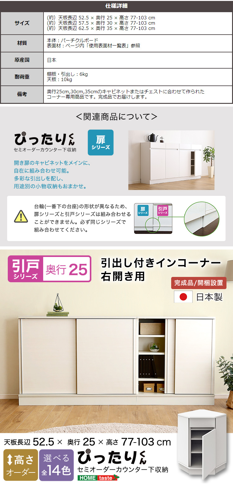 【引戸シリーズ】セミオーダーカウンター下収納ぴったりくん 引出し付きインコーナー右開き 奥行25cm