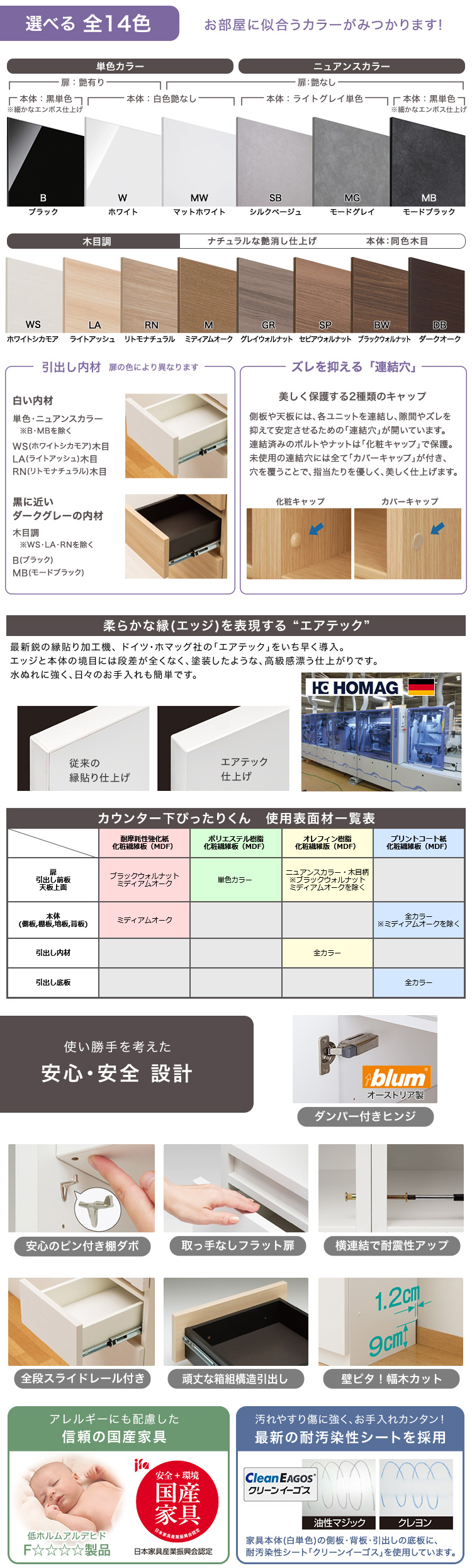 グレイウォルナット木目(艶消), シルクベージュ(艶消), セピアウォルナット木目(艶消), ダークオーク木目(艶消), ブラックウォルナット木目(艶消), ブラック(艶有), ホワイトシカモア木目(艶消), ホワイト(艶有), マットホワイト(艶消), ミディアムオーク木目(艶消), モードグレイ(艶消), モードブラック(艶消), ライトアッシュ木目(艶消), リトモナチュラル木目(艶消)