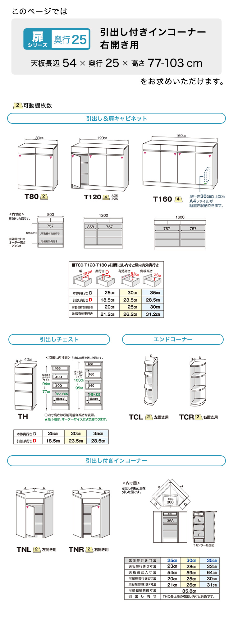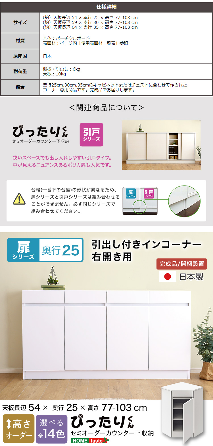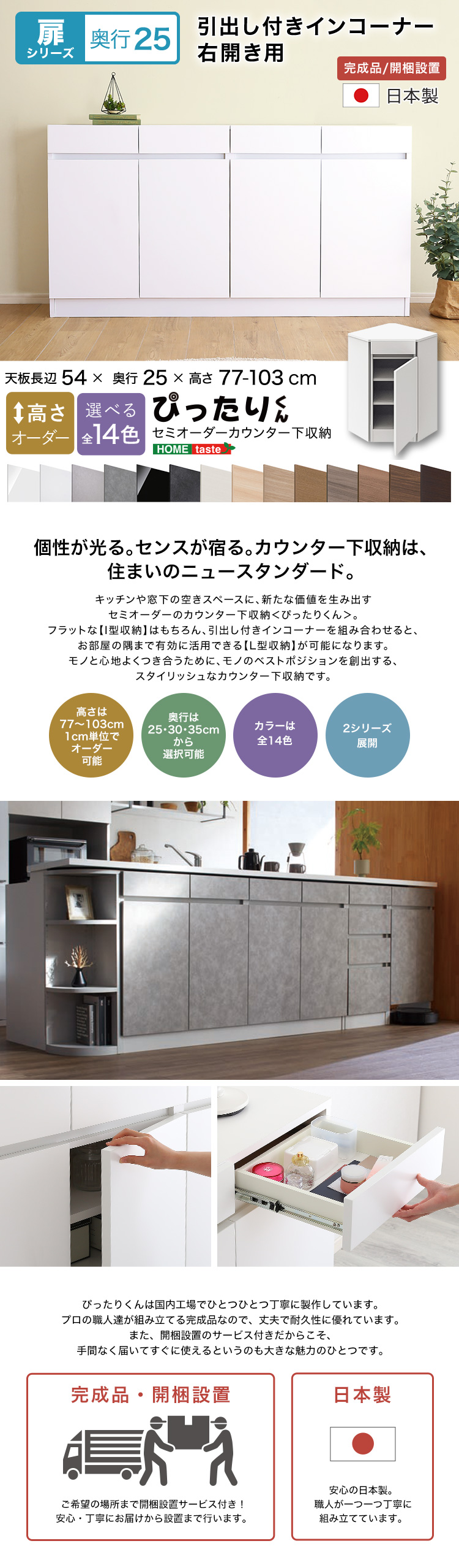 【扉シリーズ】セミオーダーカウンター下収納ぴったりくん 引出し付きインコーナー右開き 奥行25cm