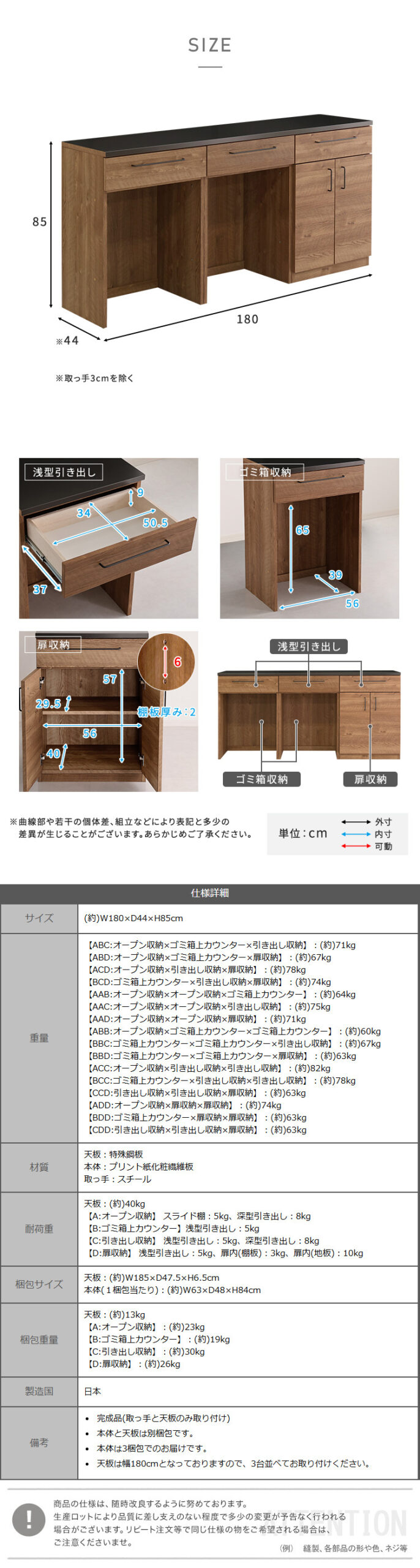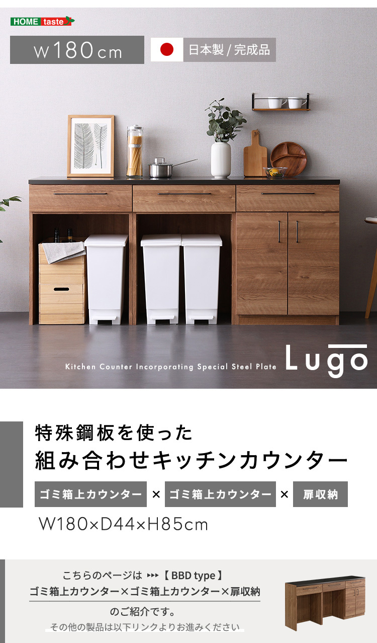 日本製 特殊鋼板を使った組み合わせキッチンカウンター 180cm ゴミ箱上カウンター+ゴミ箱上カウンター+扉収納