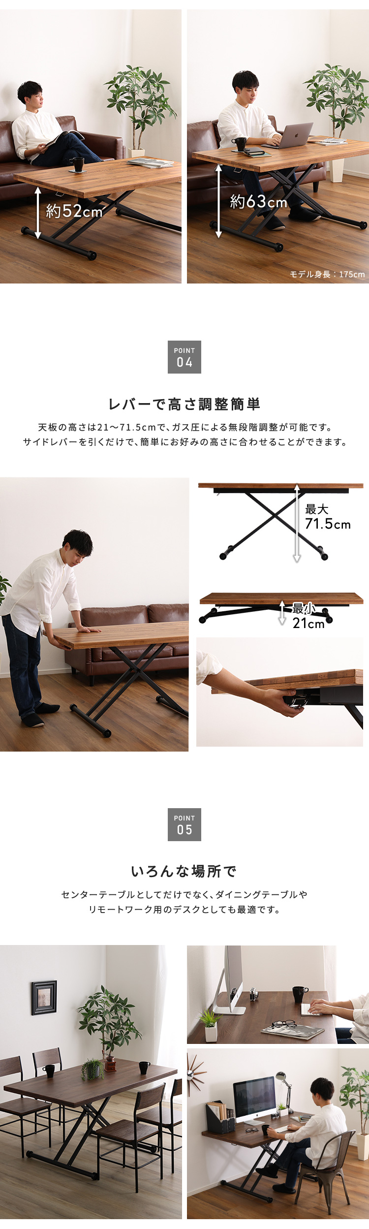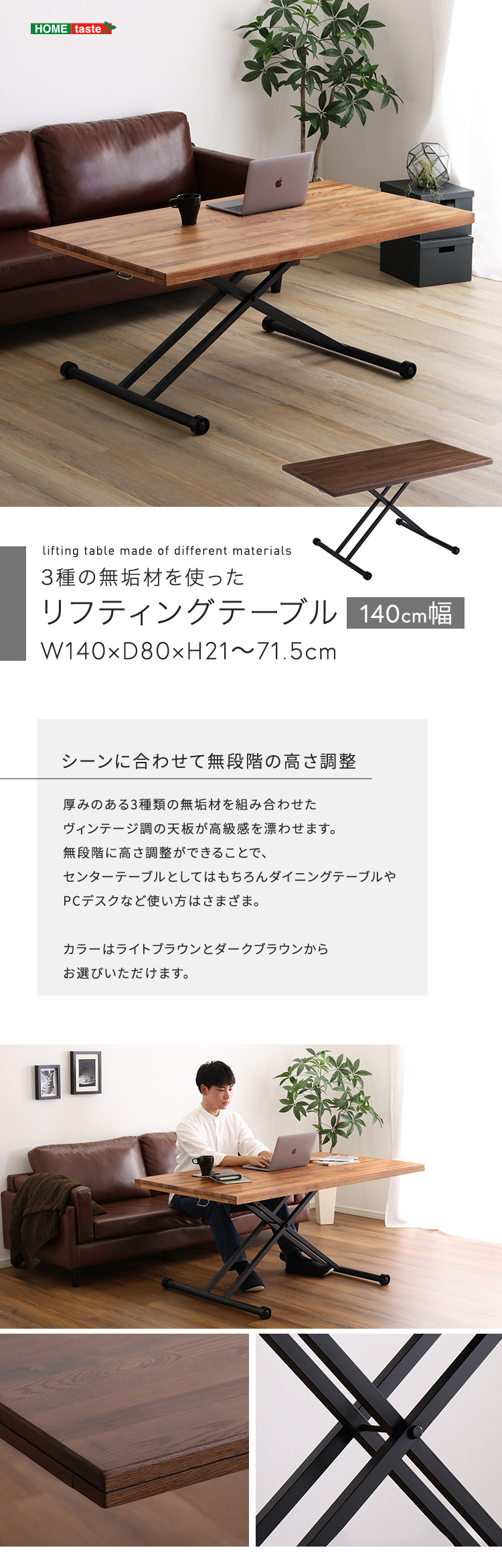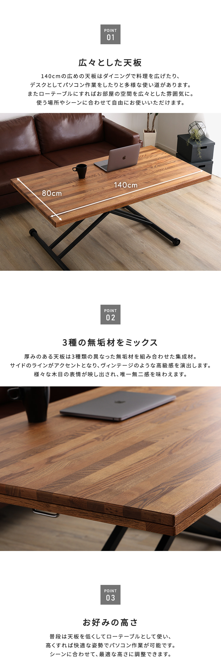 3種類の無垢材を使ったリフティングテーブル 140cm幅
