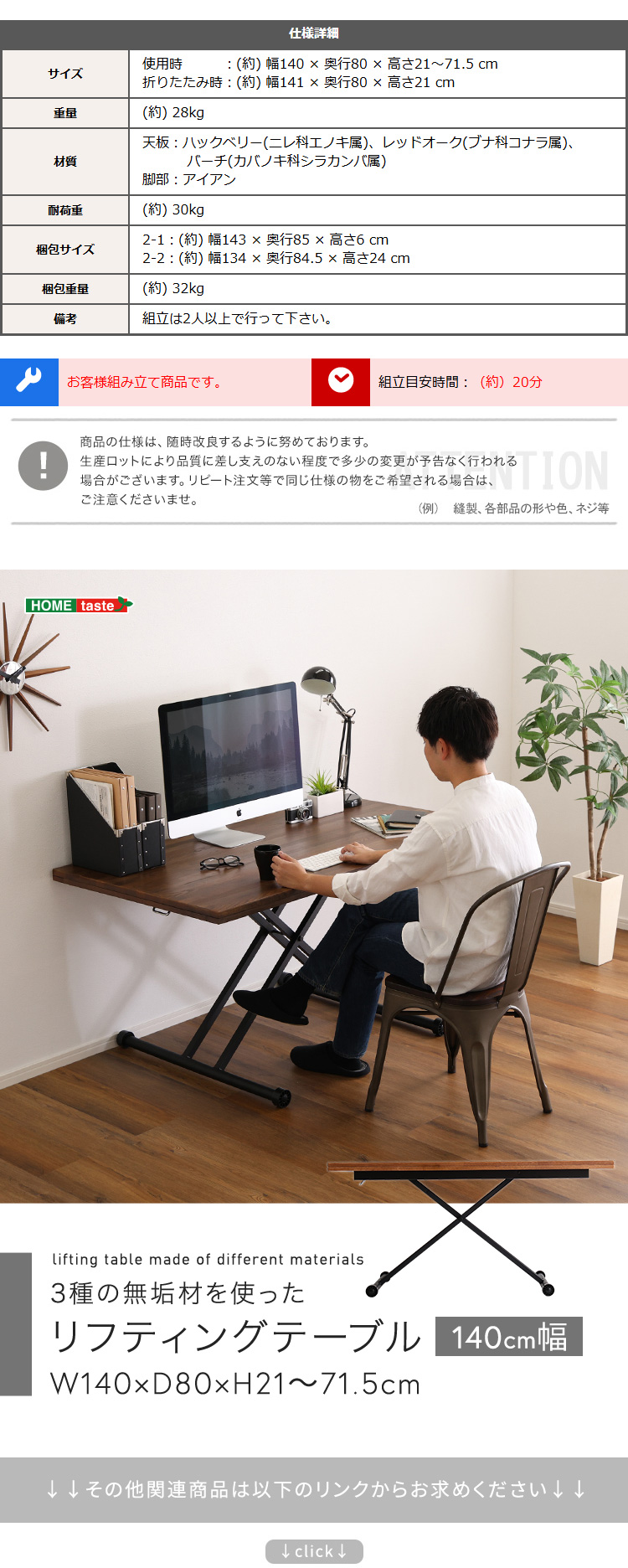 “3種類の無垢材を使ったリフティングテーブル 140cm幅” の口コミを投稿します