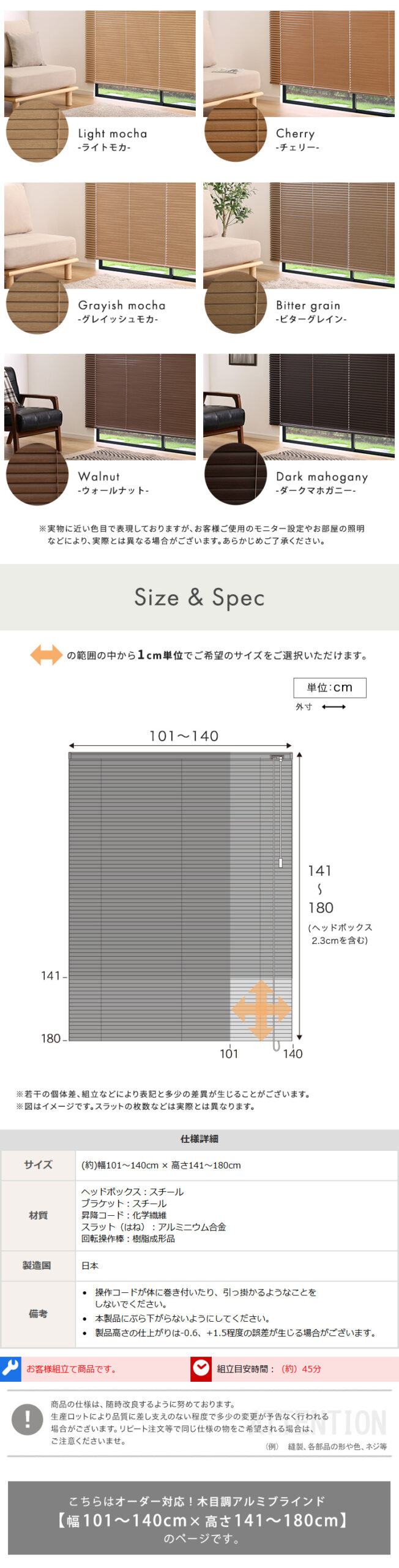 1cm単位のオーダー対応! 木目調アルミブラインド 幅101~140cm×高さ141~180cm