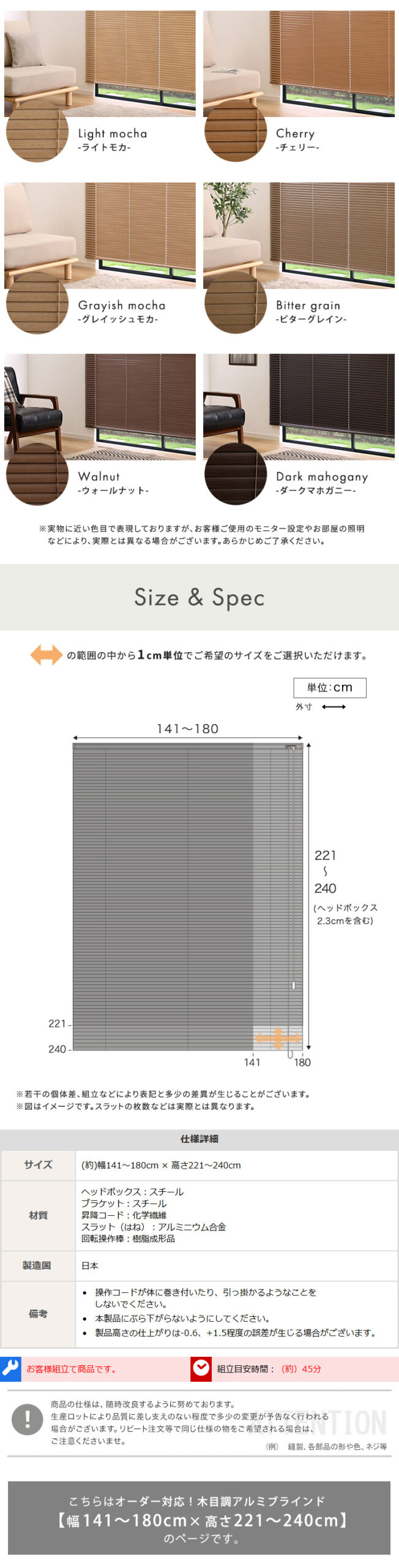 1cm単位のオーダー対応! 木目調アルミブラインド 幅141~180cm×高さ221~240cm