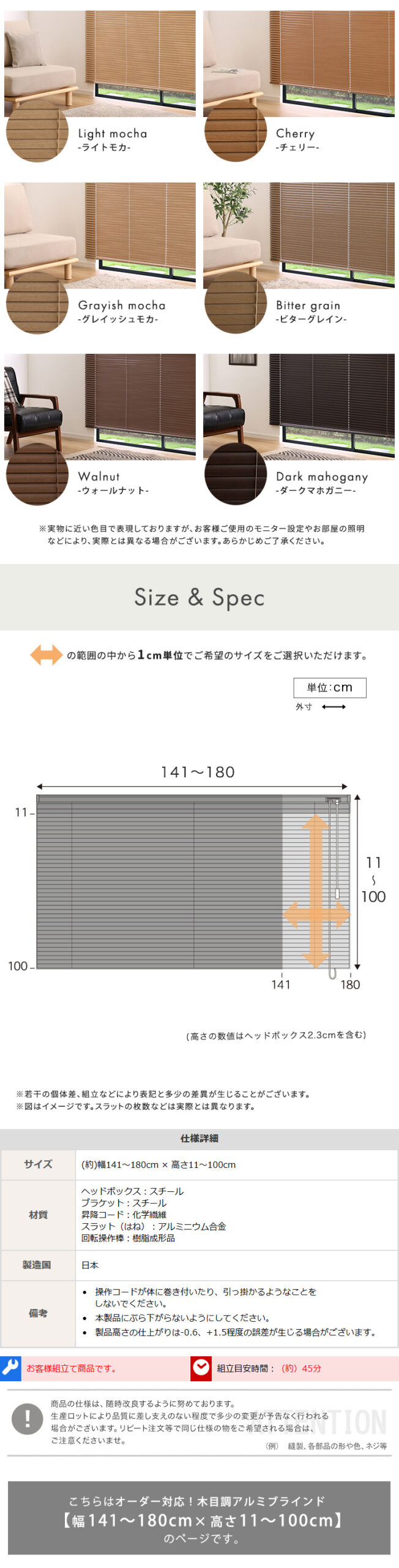 1cm単位のオーダー対応! 木目調アルミブラインド 幅141~180cm×高さ11~100cm