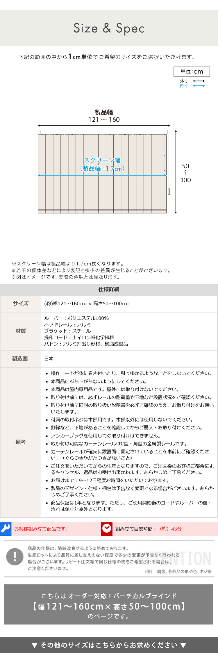 1cm単位のオーダー対応!バーチカルブラインド 幅121~160cm×高さ50~100cm