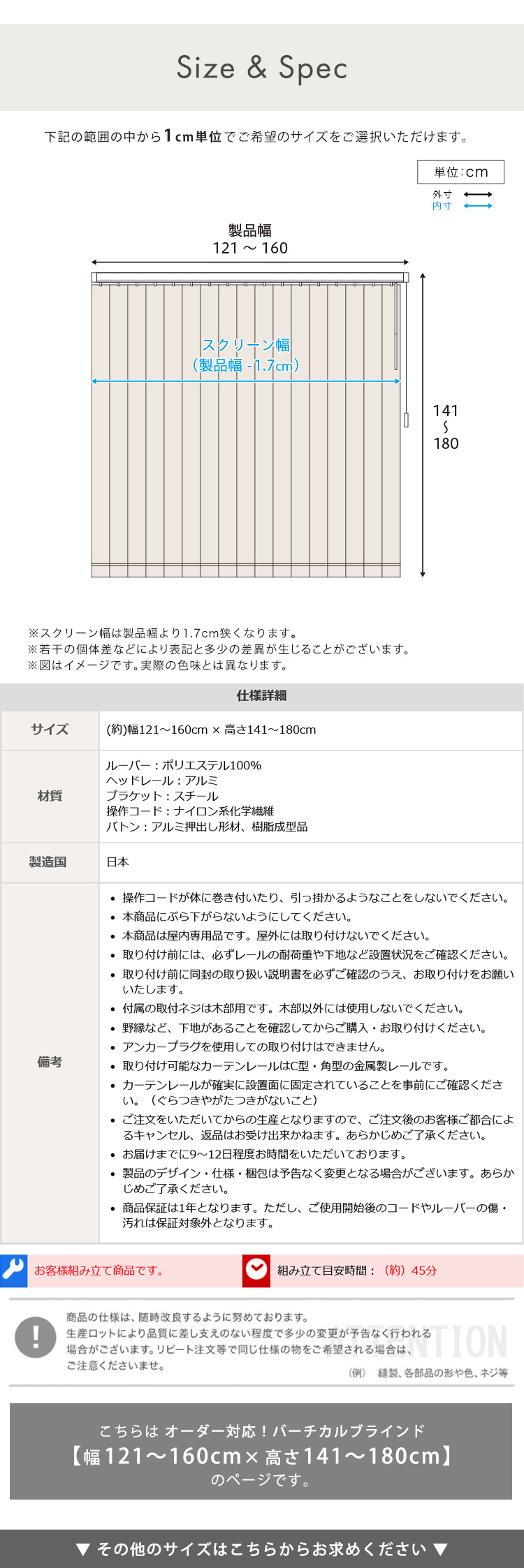 1cm単位のオーダー対応!バーチカルブラインド 幅121~160cm×高さ141~180cm