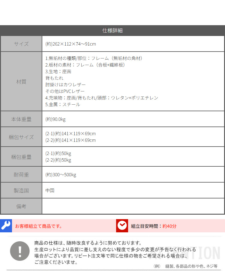 本革ソファ 4人掛け カウレザー ヘッドレス