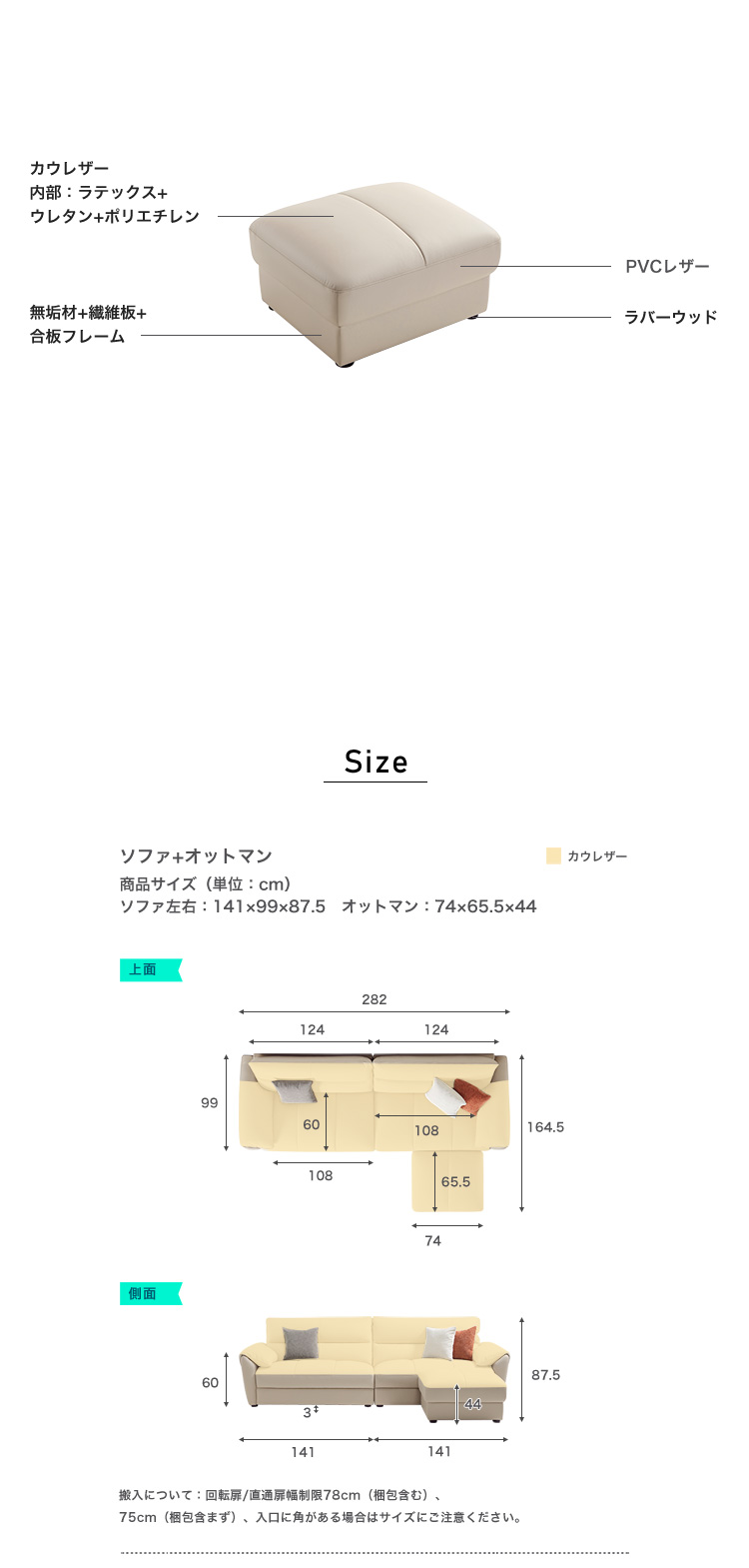 本革カウレザー 4人掛けアイボリーソファ+オットマン