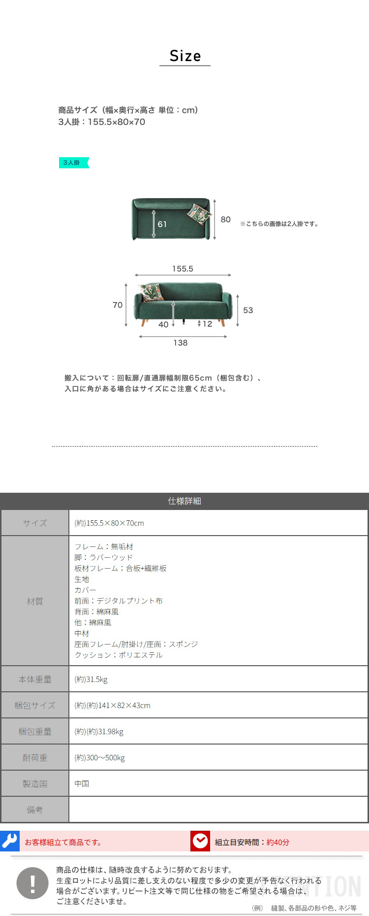 3人掛けソファ 組立 耐久性 おしゃれ