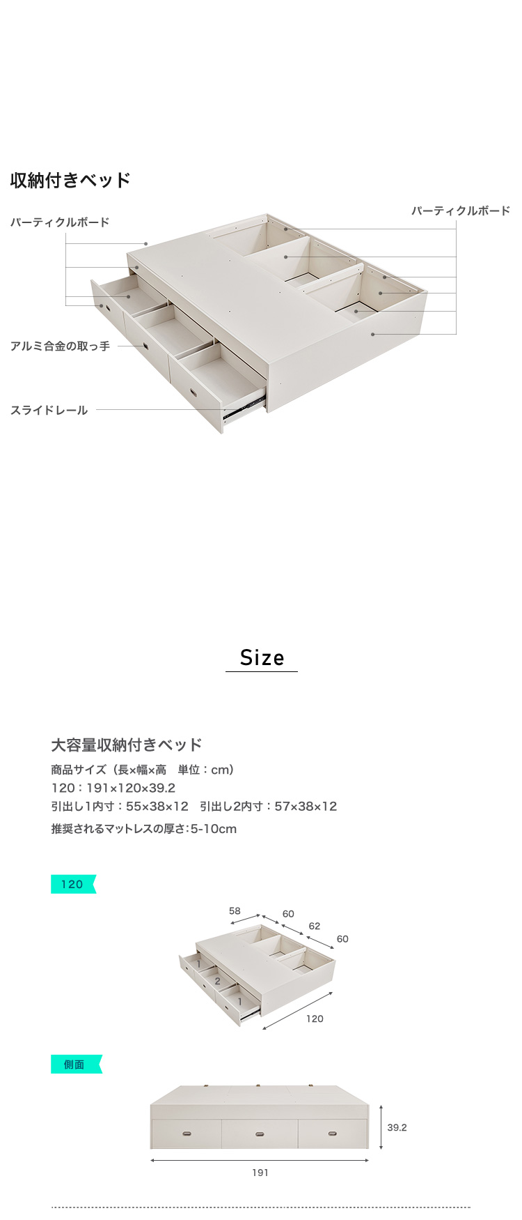 収納付きベッド 120cm ホワイト パーティクルボード
