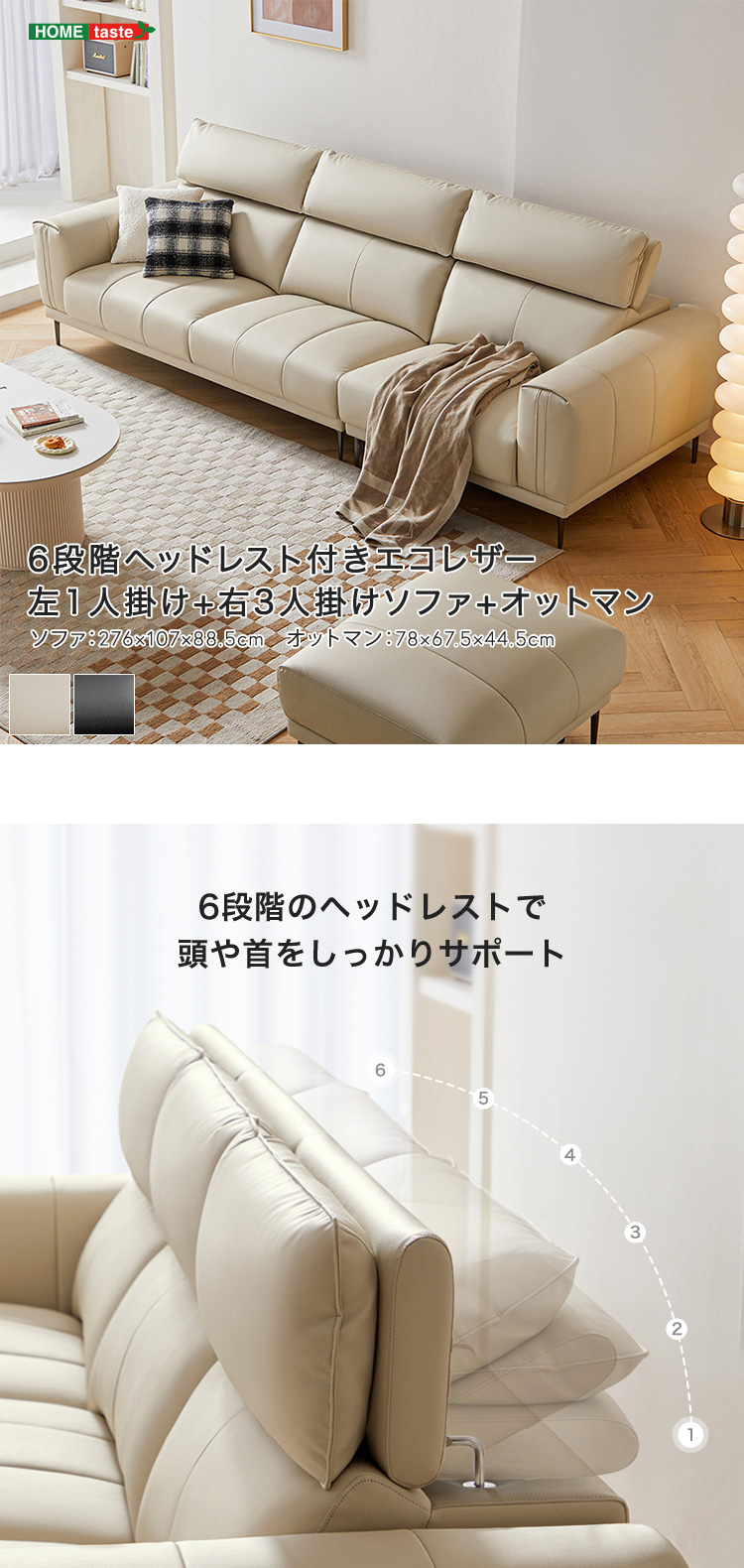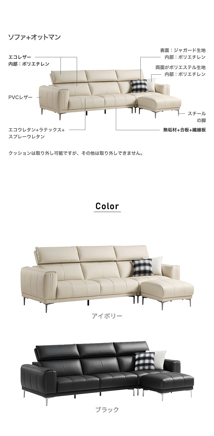 6段階ヘッドレスト付きエコレザー左1人掛け+右3人掛けソファ+オットマン