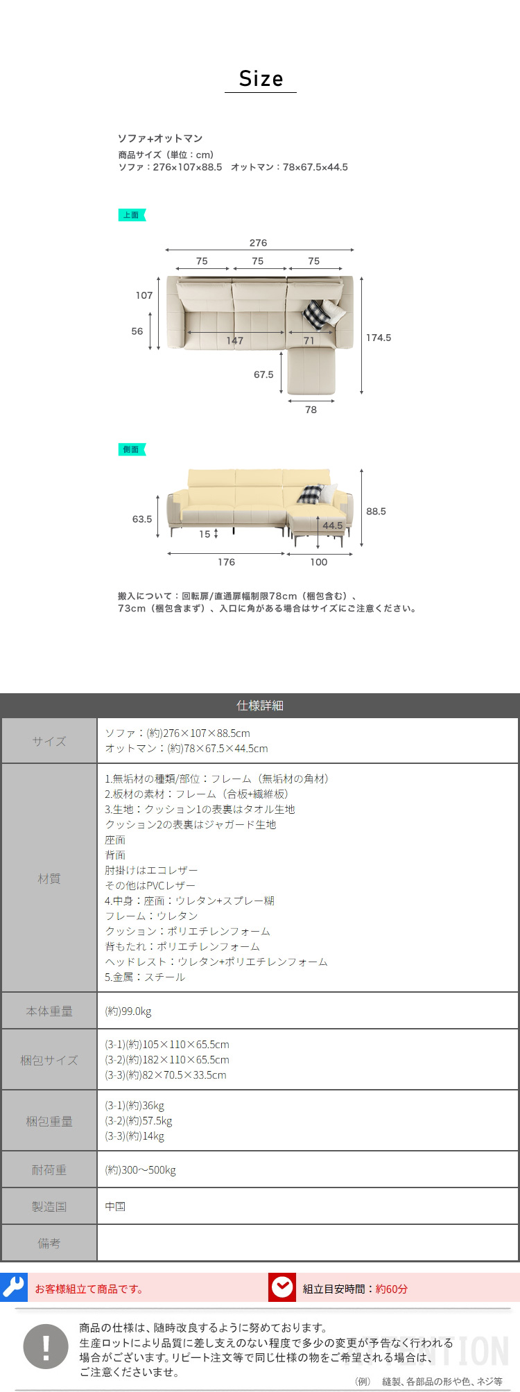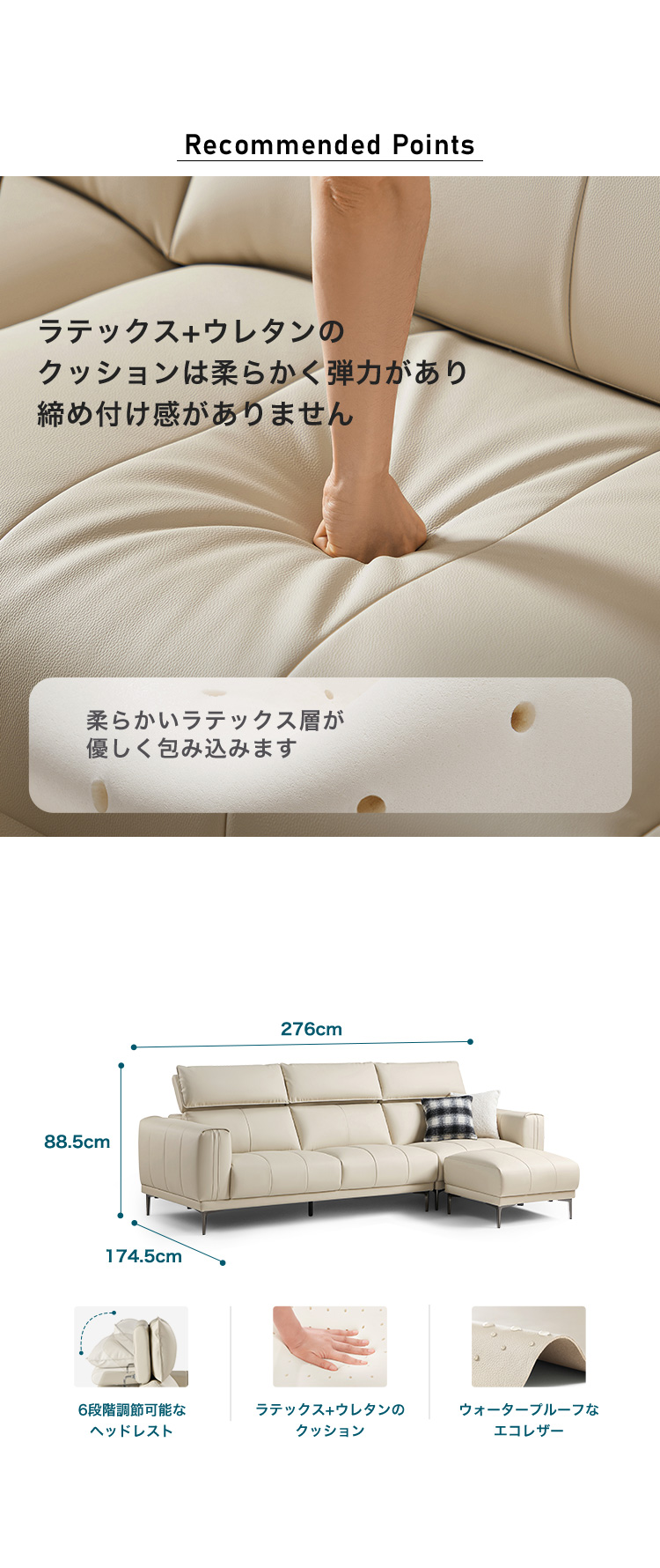 “6段階ヘッドレスト付きエコレザー左1人掛け+右3人掛けソファ+オットマン” の口コミを投稿します