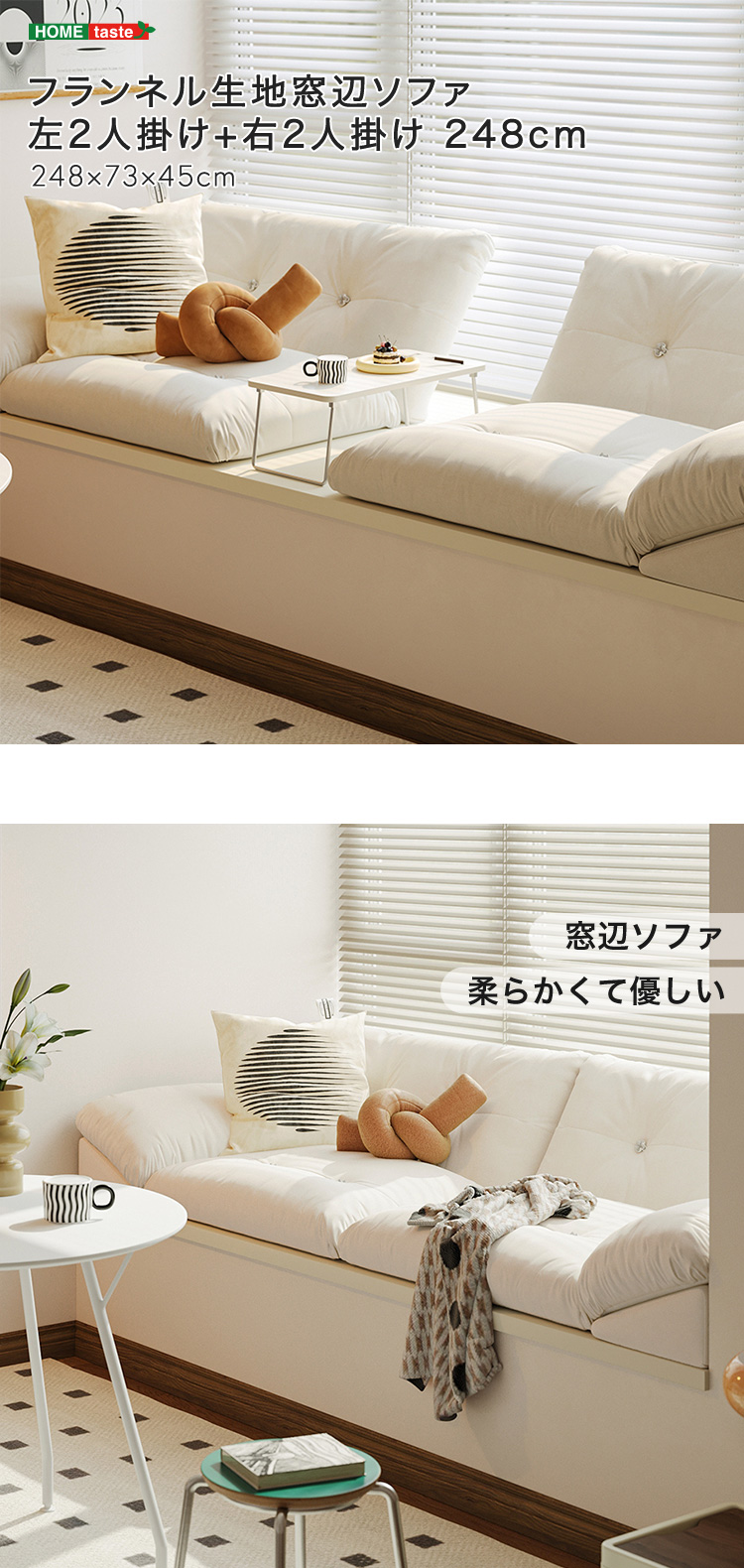 フランネル生地窓辺ソファ 左2人掛け+右2人掛け 248cm