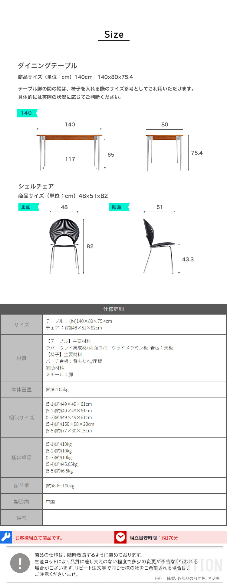 ダイニングテーブル 140cm シェルチェア 6脚セ