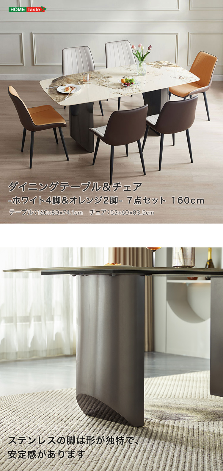 ダイニングテーブル&チェア-ホワイト4脚&オレンジ2脚 - 7点セット 160cm