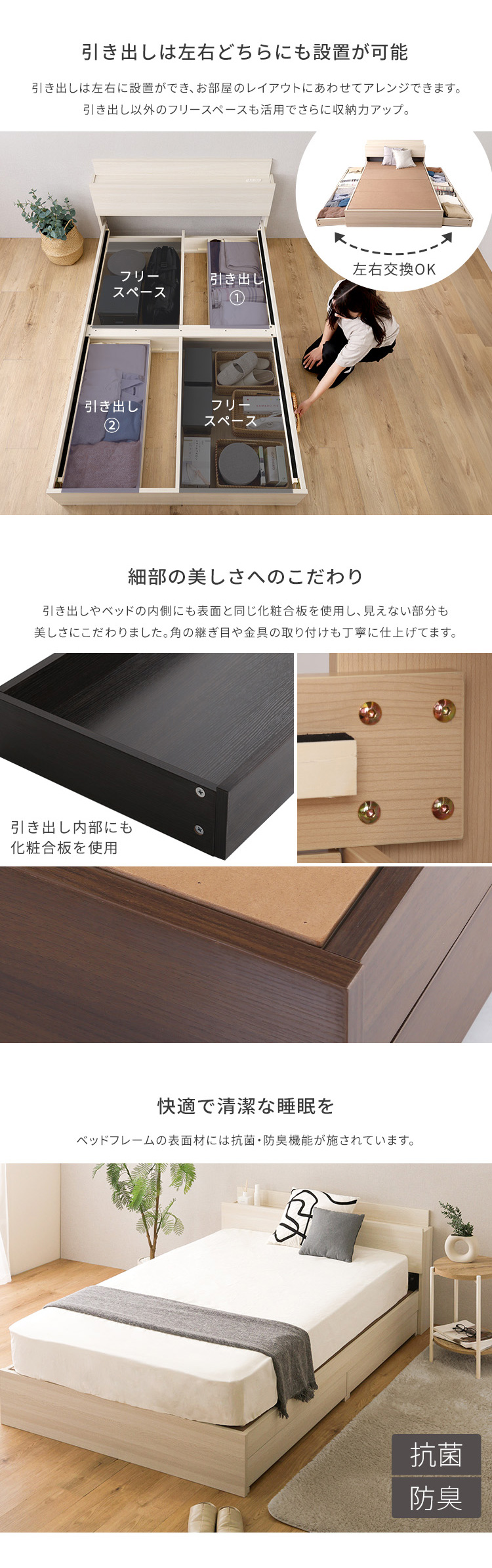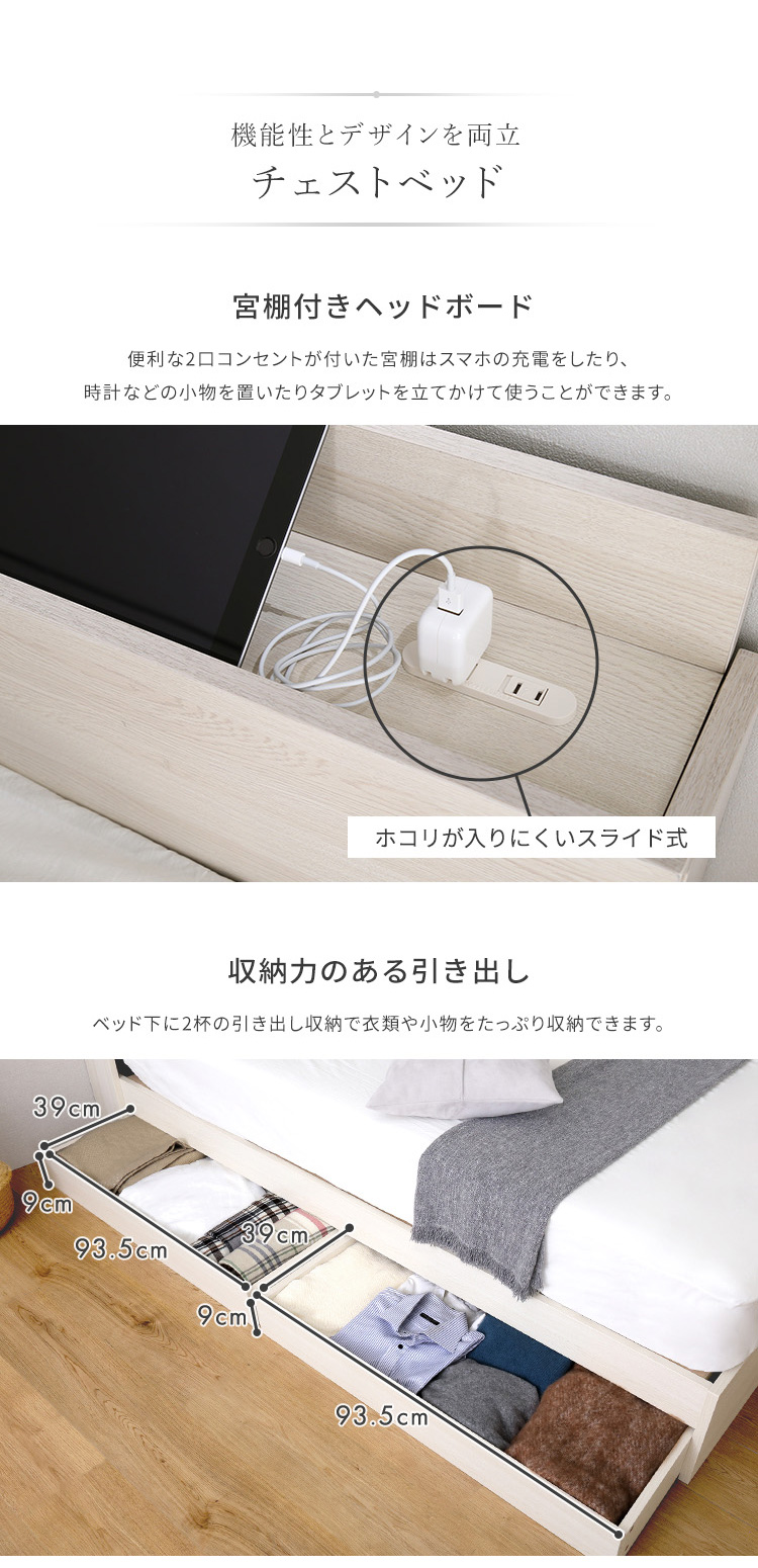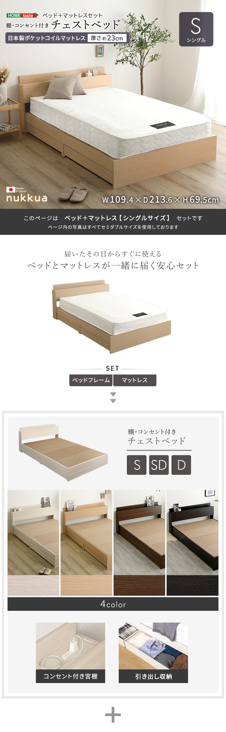棚・コンセント付きチェストベッド 日本製ポケットコイルマットレスセット(シングル)