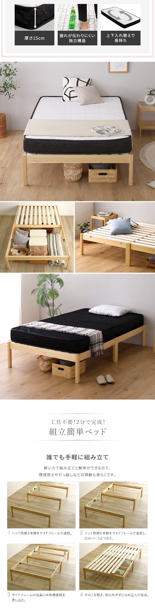 2分で完成!組立簡単ベッド ハイタイプ ポケットコイルマットレスセット(ダブル)