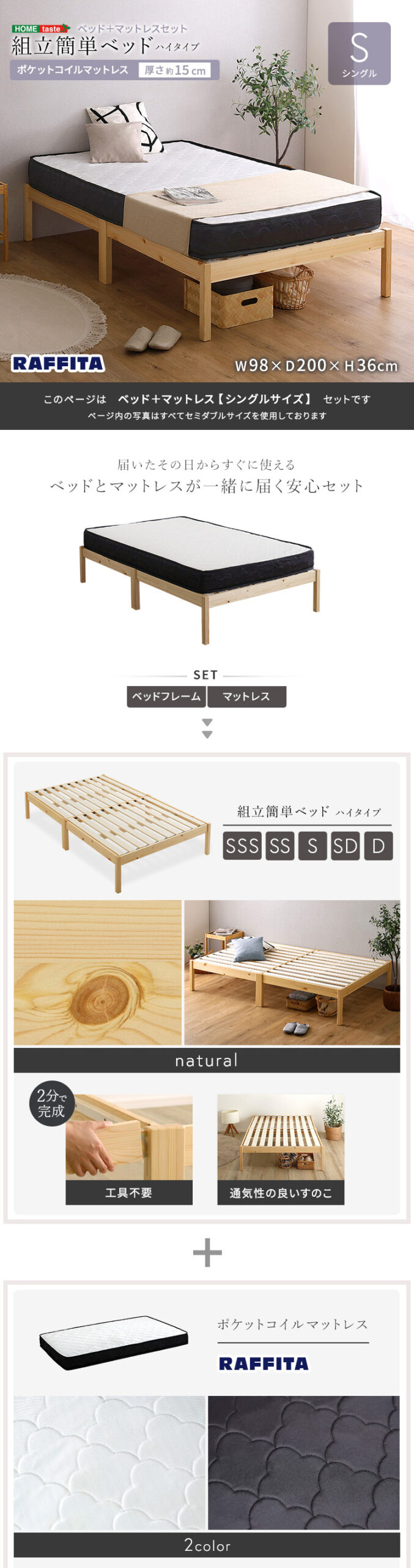 2分で完成!組立簡単ベッド ハイタイプ ポケットコイルマットレスセット(シングル)