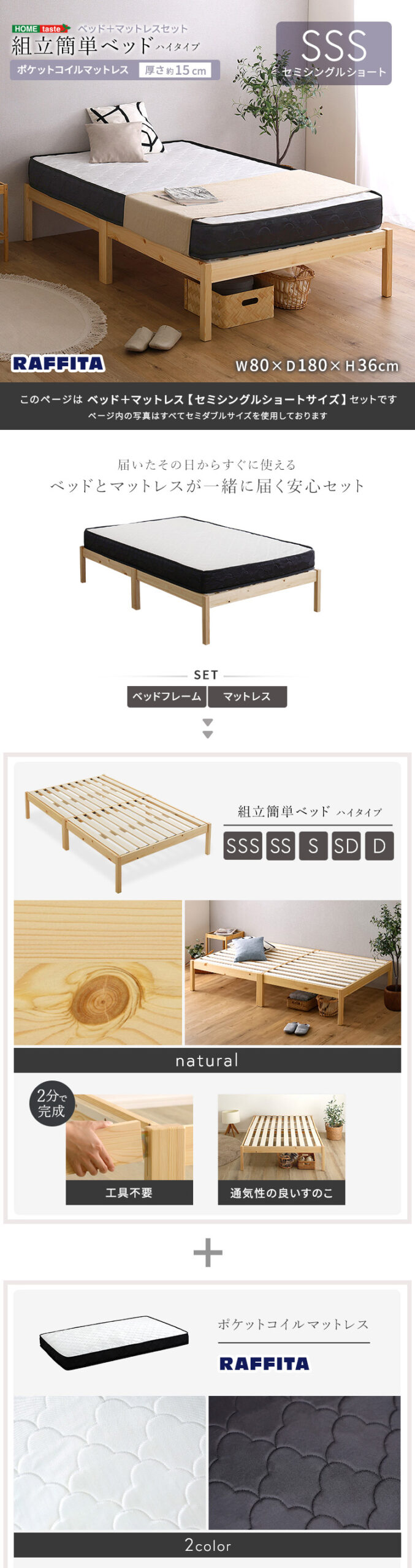 2分で完成!組立簡単ベッド ハイタイプ ポケットコイルマットレスセット(セミシングル)