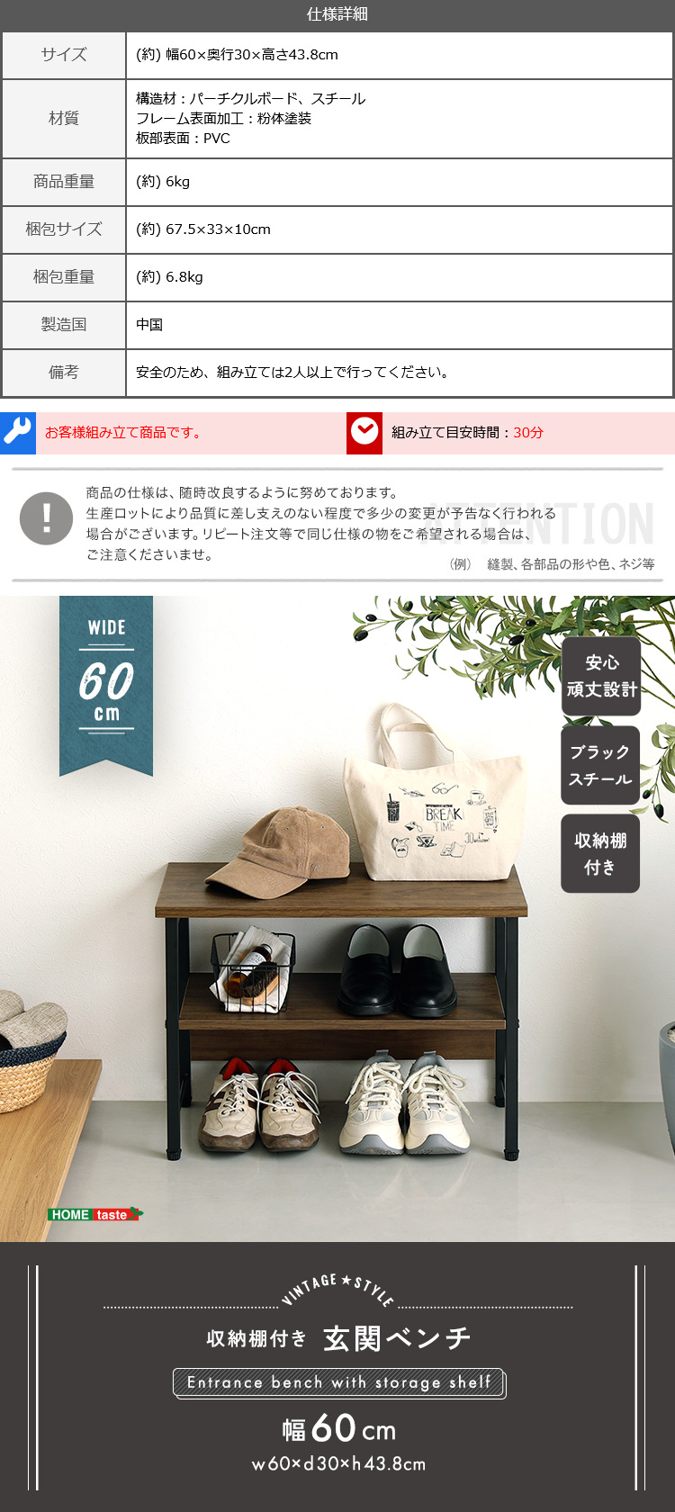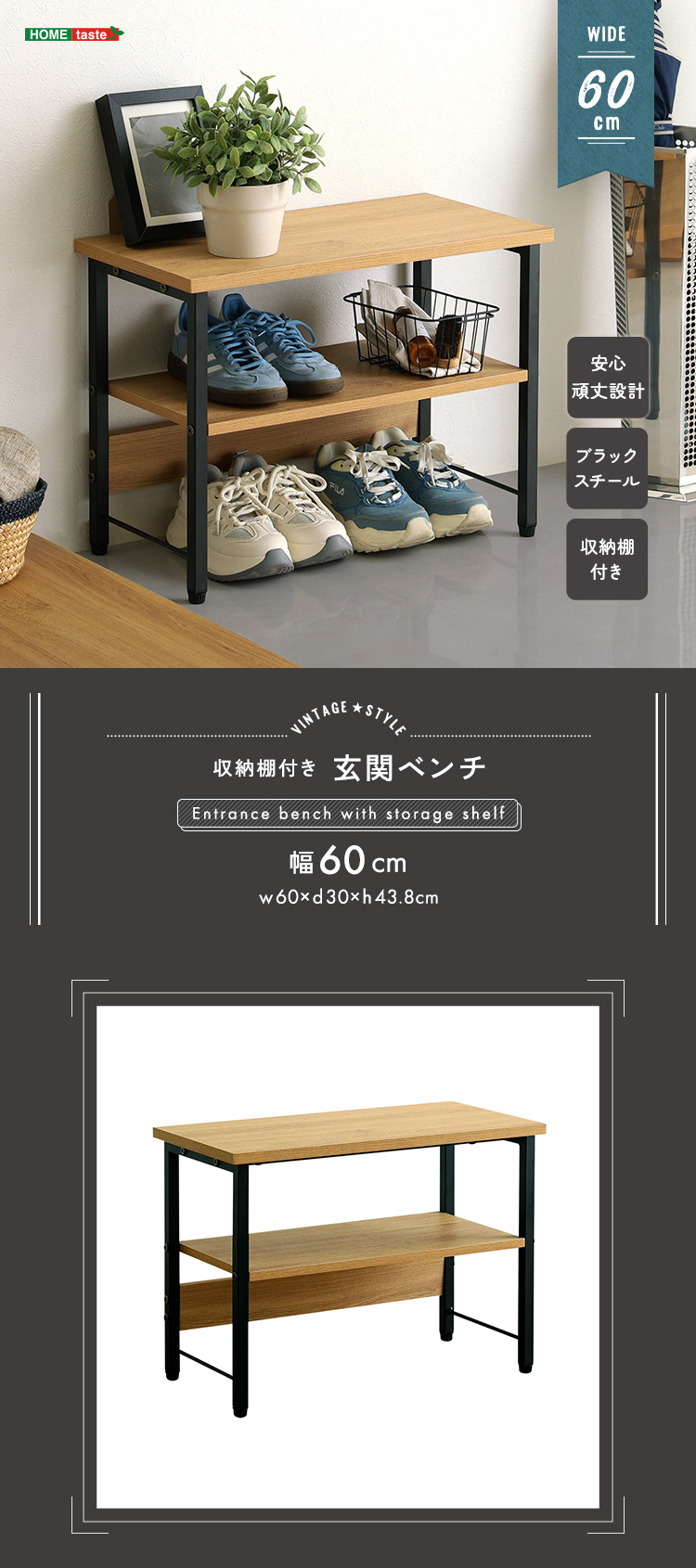 ヴィンテージ調 収納棚付き玄関ベンチ